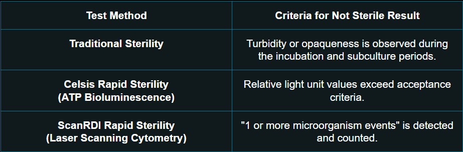 A sterility test detects microbial contamination and provides data to determine whether a product is ready for release. A “Sterile” result indicates no contaminating microorganism is found in the sample. A “Not Sterile” result indicates microbial growth, and the product examined does not comply with the test for sterility, unless it is demonstrated that the test is invalid for causes unrelated to the product examined.